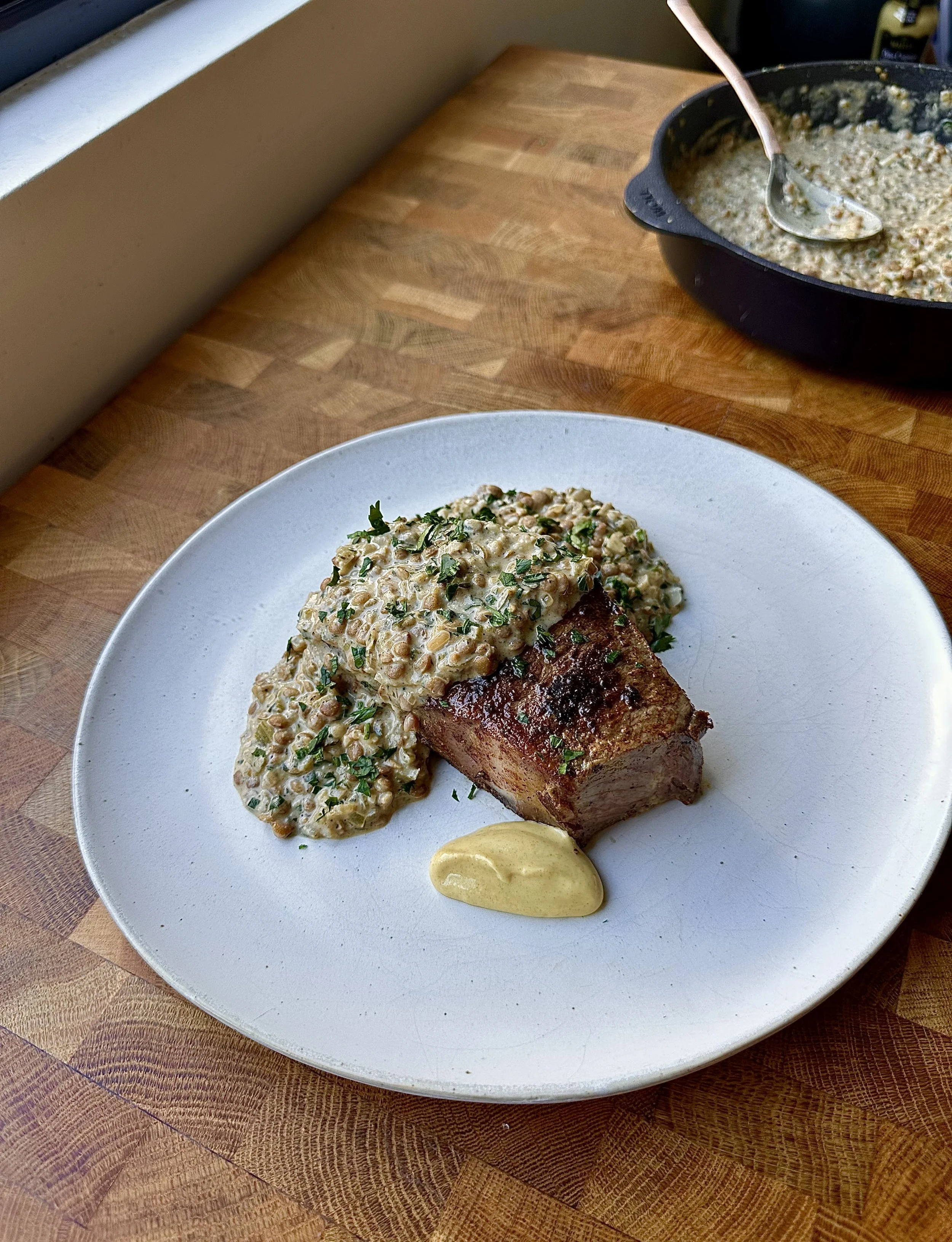 The beef and Dijon lentils recipe strikes the perfect balance between creamy comfort and bold punch. The lentils, luxuriously smooth and rich with a tangy bite from the mustard, bring a vibrant zing that cuts through the steak’s juicy, medium rare goodness.