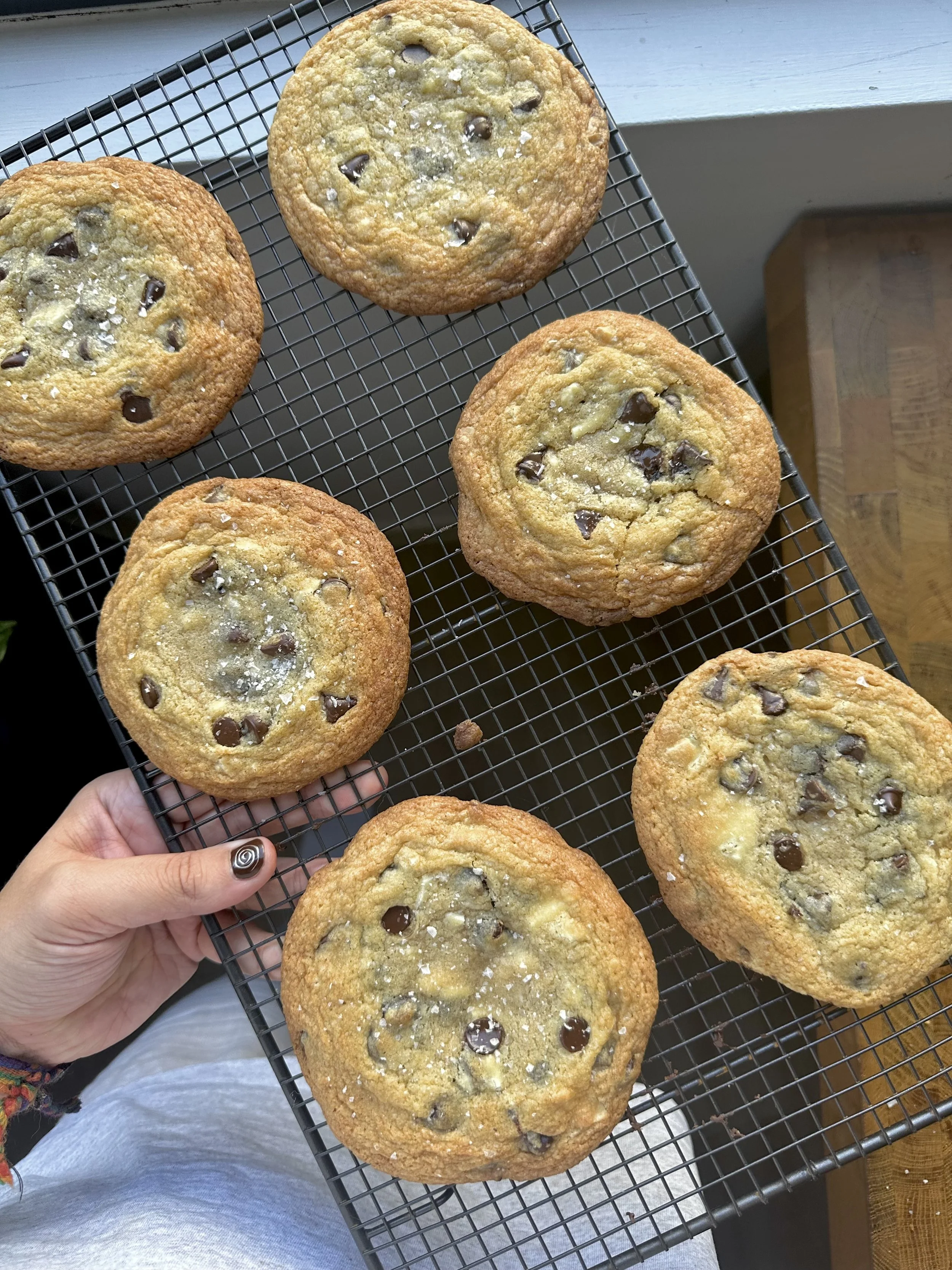After chilling the cookies in the freezer, place 5 balls of cookie at a time on a lined baking tray and then bake for 12-15 minutes. You’re looking for sltighy brown edges and just fully cooked in the middle. Remove tray from oven, sprinkle with pinches of sea salt and allow cookies to sit on tray for 1-2 minutes before transferring to a wire rack. Repeat process until all cookies are cooked and store in a close container 3-5 days at room temperature.