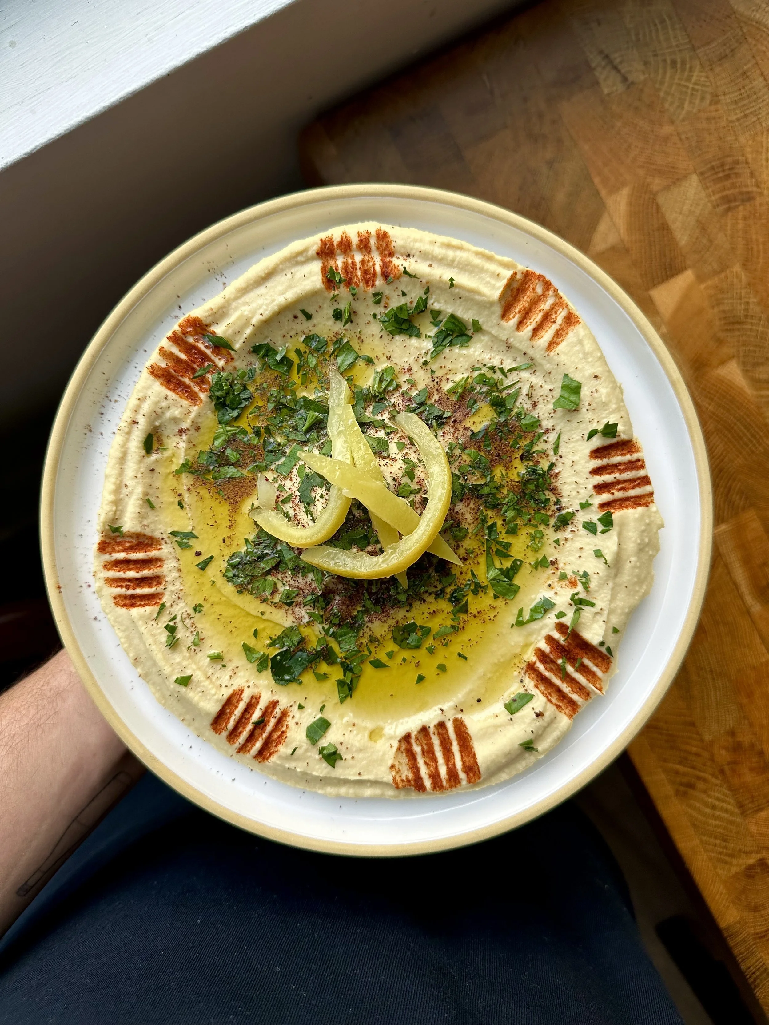Store hummus in container in fridge for up to a week or freeze for up to 6 months and defrost whenever you like. When serving, spoon onto plate and then draw a ‘o’ into hummus to create a well. Using a fork, dunk it in cold water and then paprika, and then stamp the outside wall of the hummus 8 times around. Add EVOO, sumac and rough chopped fresh parsley to the middle before finishing with diced preserved lemon.