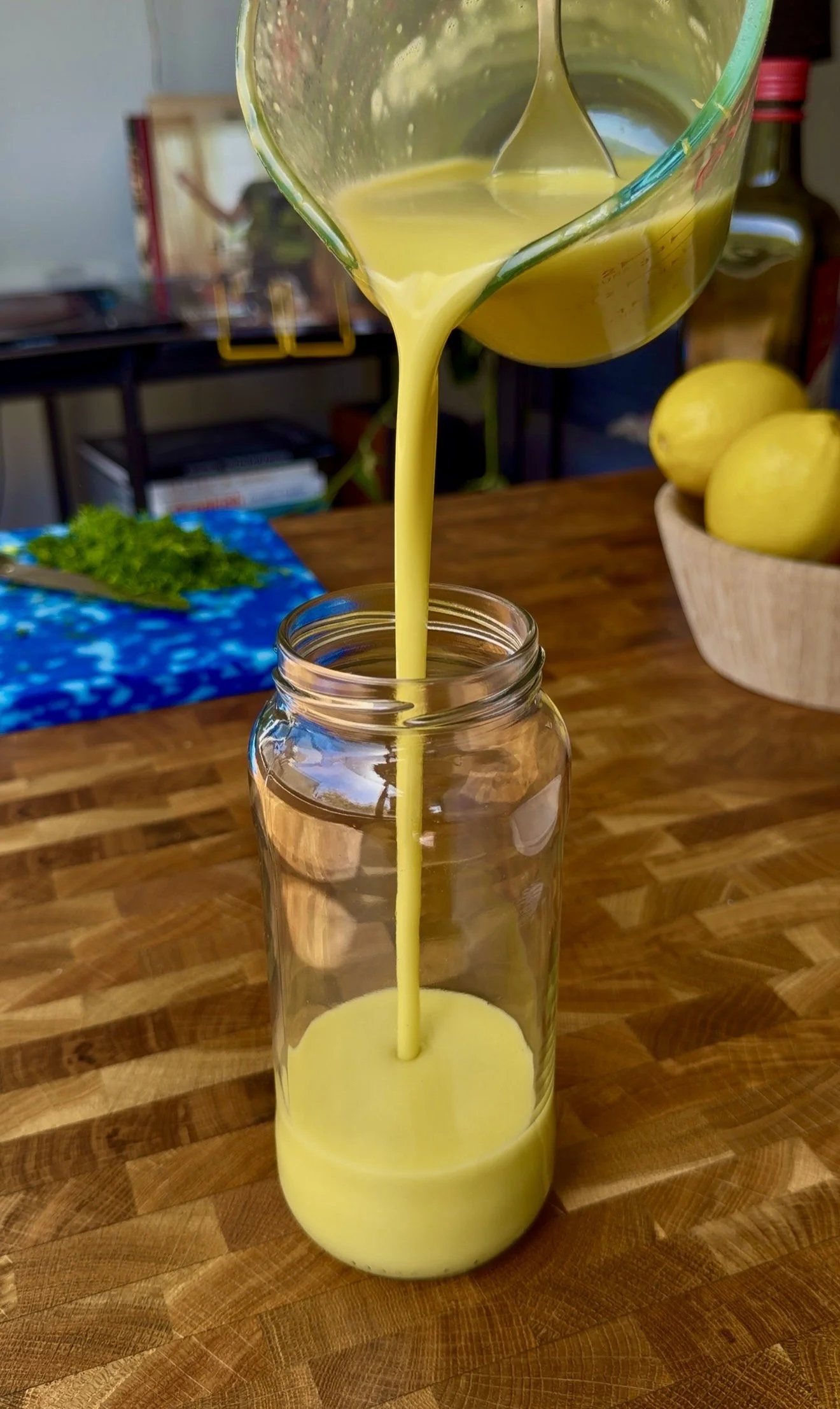 Ladolemono literally translates from Greek as "oil-lemon", a bright, zesty emulsion of extra virgin olive oil, fresh lemon juice, and salt, sometimes with a pinch of crushed garlic, dijon mustard (which is what I like to add) or scatter of oregano. It’s essentially a rustic lemon vinaigrette but thicker and silkier, often brought together by whisking, shaking or a modern way of blitzing with an emersion blender until it’s golden and glossy. The flavours are simple but bold, the fruity creaminess of Greek extra virgin olive oil softened by the acidic lift of lemon, which makes it both refreshing and deeply comforting.