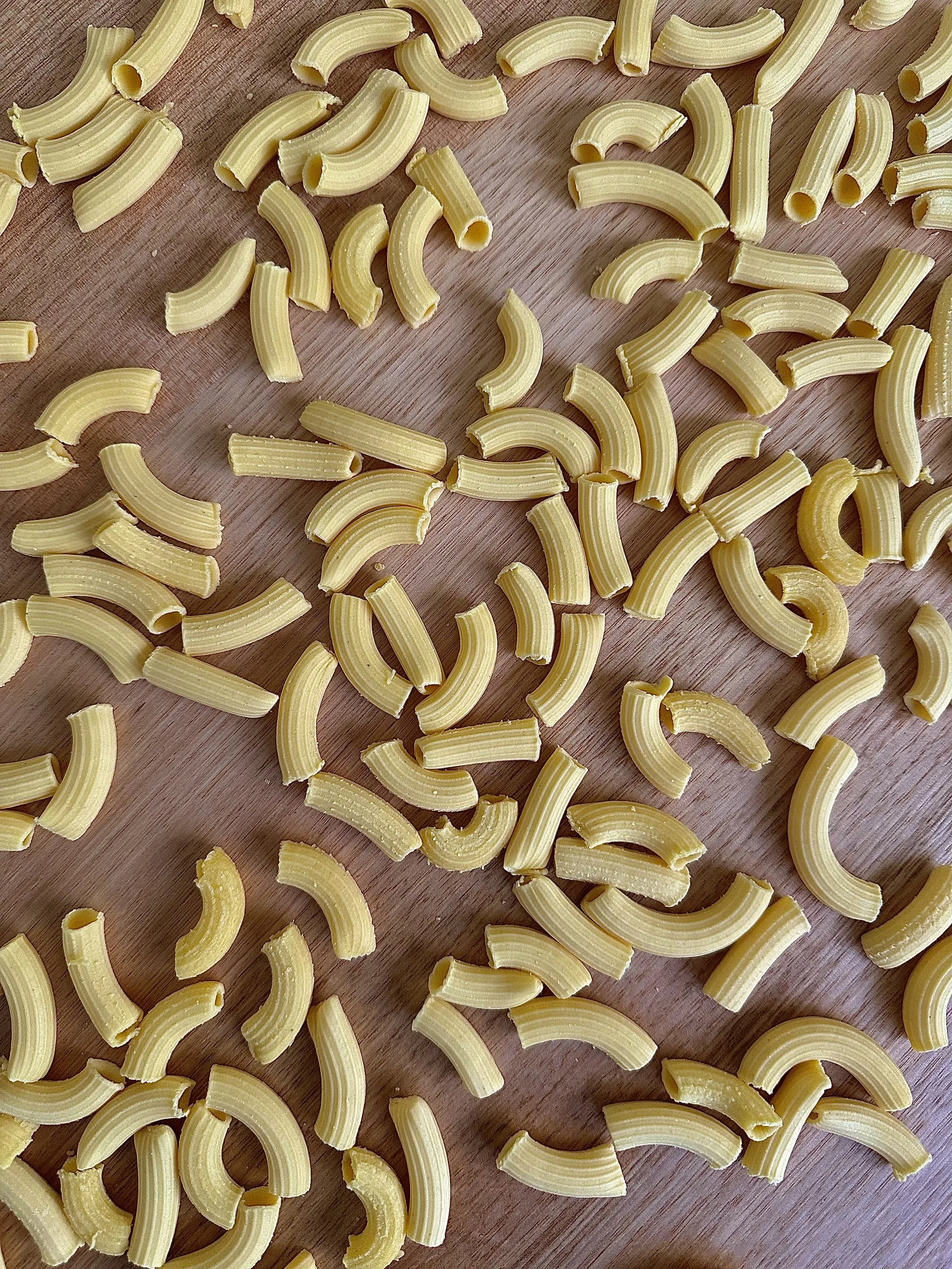 Pop your pasta extractor/press on with a macaroni pasta plate and push your dough into it halfway, using a cylinder object to push it in. You want the bottom half of your press full at all times. The first few inches of rigatoni remove as it will be curly and dry, but once thats gone allow your macaroni to fall to a half a thumb length and then cut when you have reached your desired size. Lightly flour and leave to dry out at room temperature.