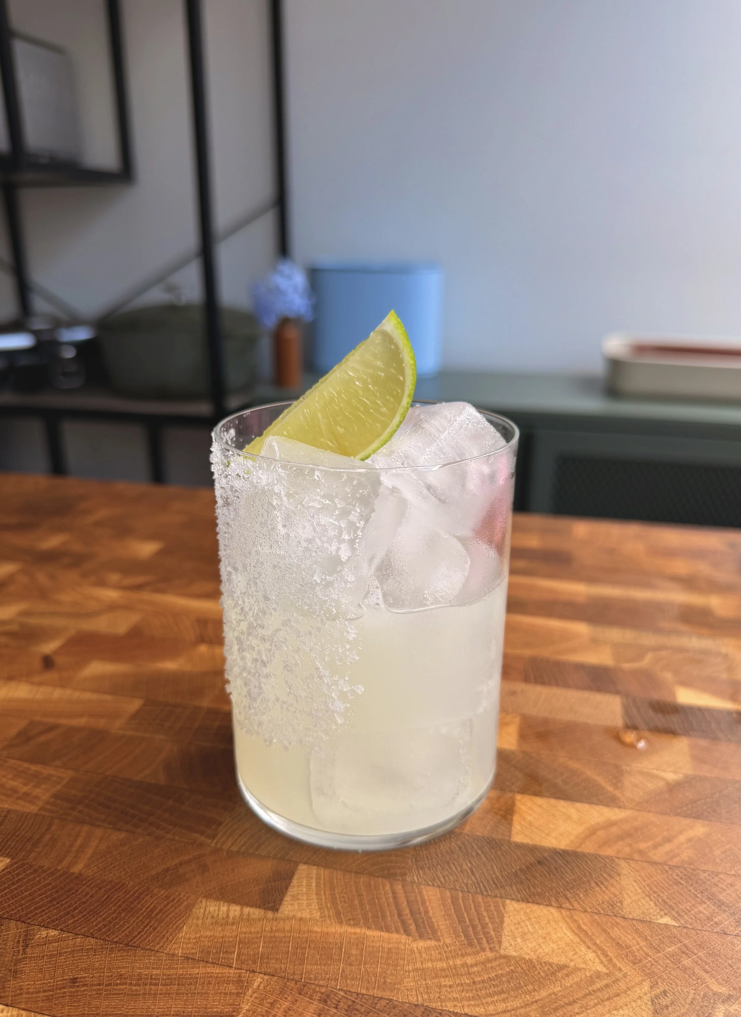 Fill the chilled salt rimmed glass with ice cubes and then double strain the margarita over the top before finishing with lime wedge for garnish and enjoy responsibly.