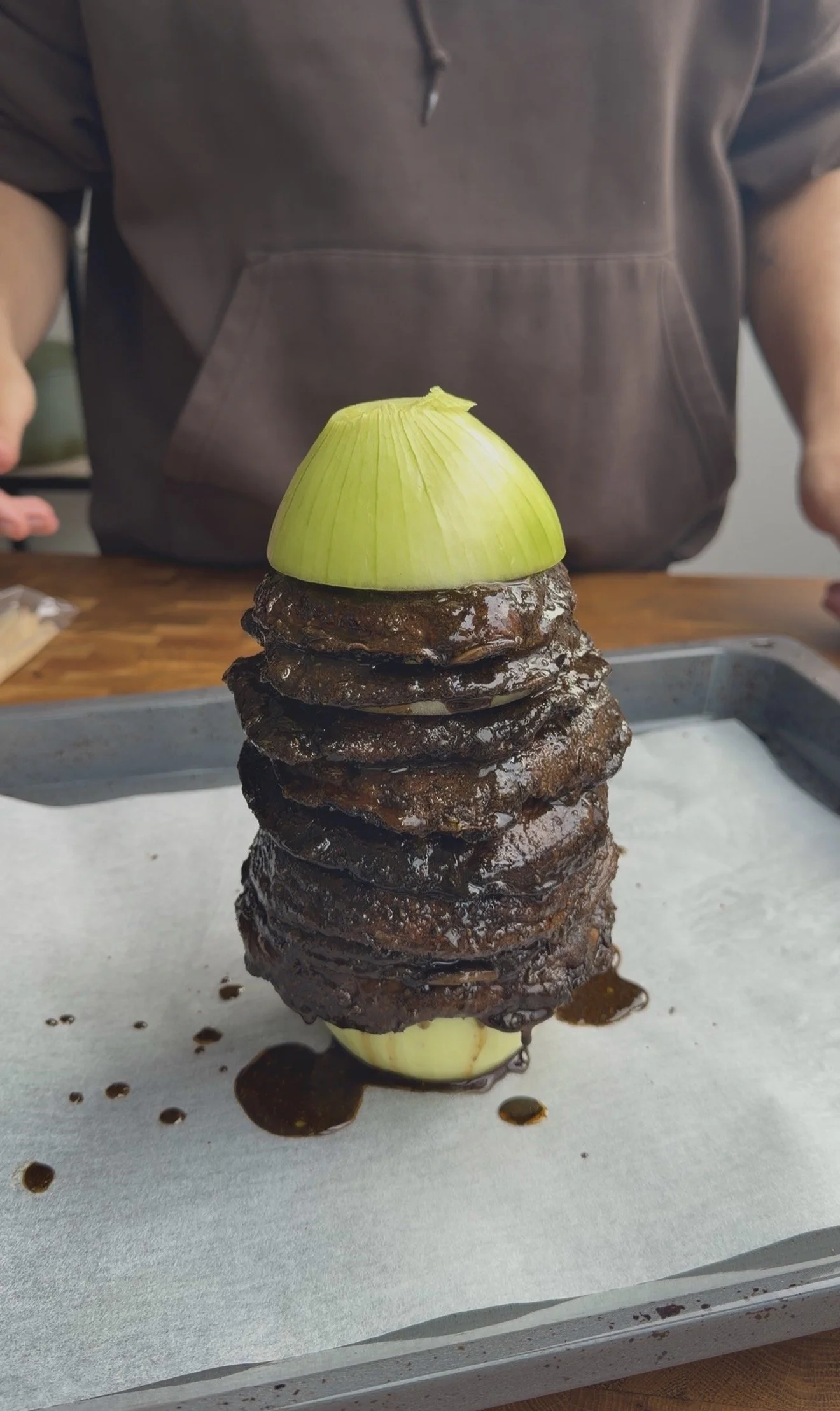 Peel brown onion and cut in half horizontally, before levelling the bottom onion so it sits flat. Poke two large skewers into the bottom onion and then add the marinated mushrooms ones after another onto the skewers, adding a couple more skewers if you need more stability. Finish with the top onion head, drizzle of EVOO before popping into oven standing up and cooking for 1 hour or until deeply charred. Once roasted, slice downwards for mushroom slices and fill up the gyro.