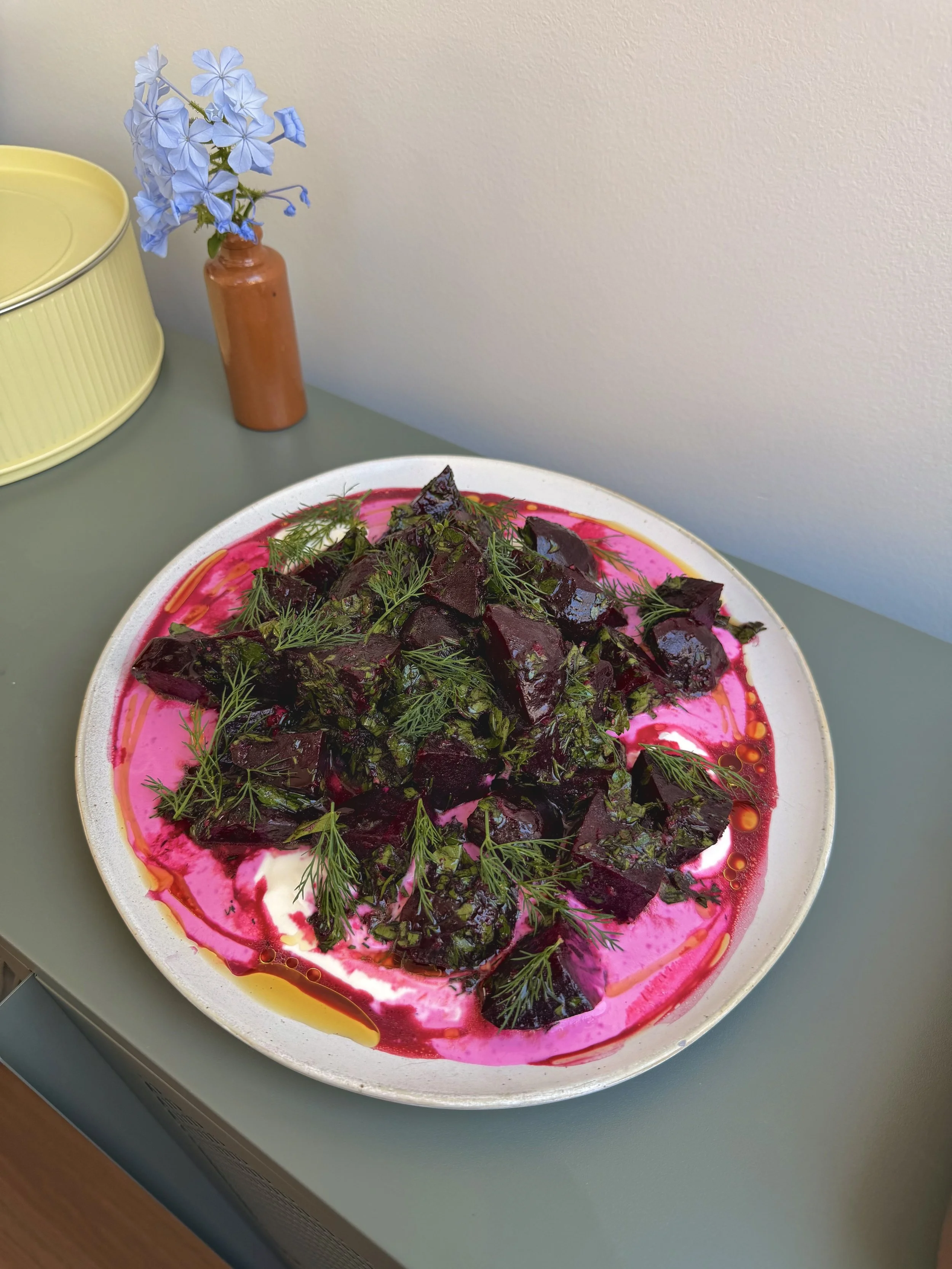 Patzarosalata is a vibrant Greek beetroot salad that gleams magenta and sings with earthy, tangy flavours. Traditionally made from cooked beetroot (boiled or roasted) mixed with herbs, garlic, olive oil, lemon juice or red wine vinegar and then place on a bed of greek yoghurt that gets mixed through. The dish is simple and really celebrates the wonderful rot vegetable that is beetroot that can be overlooked.