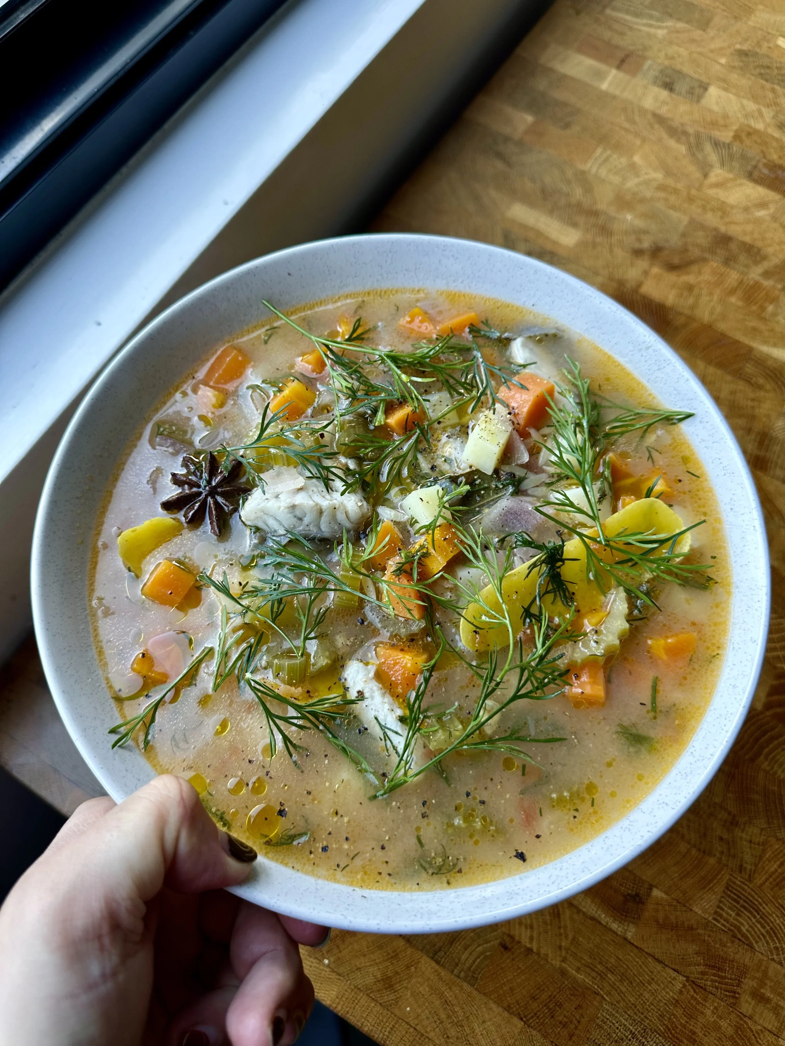Once fish stoked has simmered, strain the liquid out into a fresh big pot, making sure to remove everything from the stock. In the strained stock add in the red onion, potatoes, carrots, dill, bay leaves, star anise and the two tomatoes grated, so that just the pulp makes it in and dispose of the skin. Add the peels of the lemon as well and place on high heat. Bring to gentle simmer and allow to simmer for 10 minutes. After 10 minutes stir through the orzo pasta and then after 5 more minutes add in the pieces of fish and finely chopped dill and cook for 5 more minutes (20 minute cook all up, cook for longer if needing more al dente on the potatoes or orzo). Add in the juice of the lemon and season with salt to taste before serving up with fresh cracked black pepper and a drizzle of EVOO.