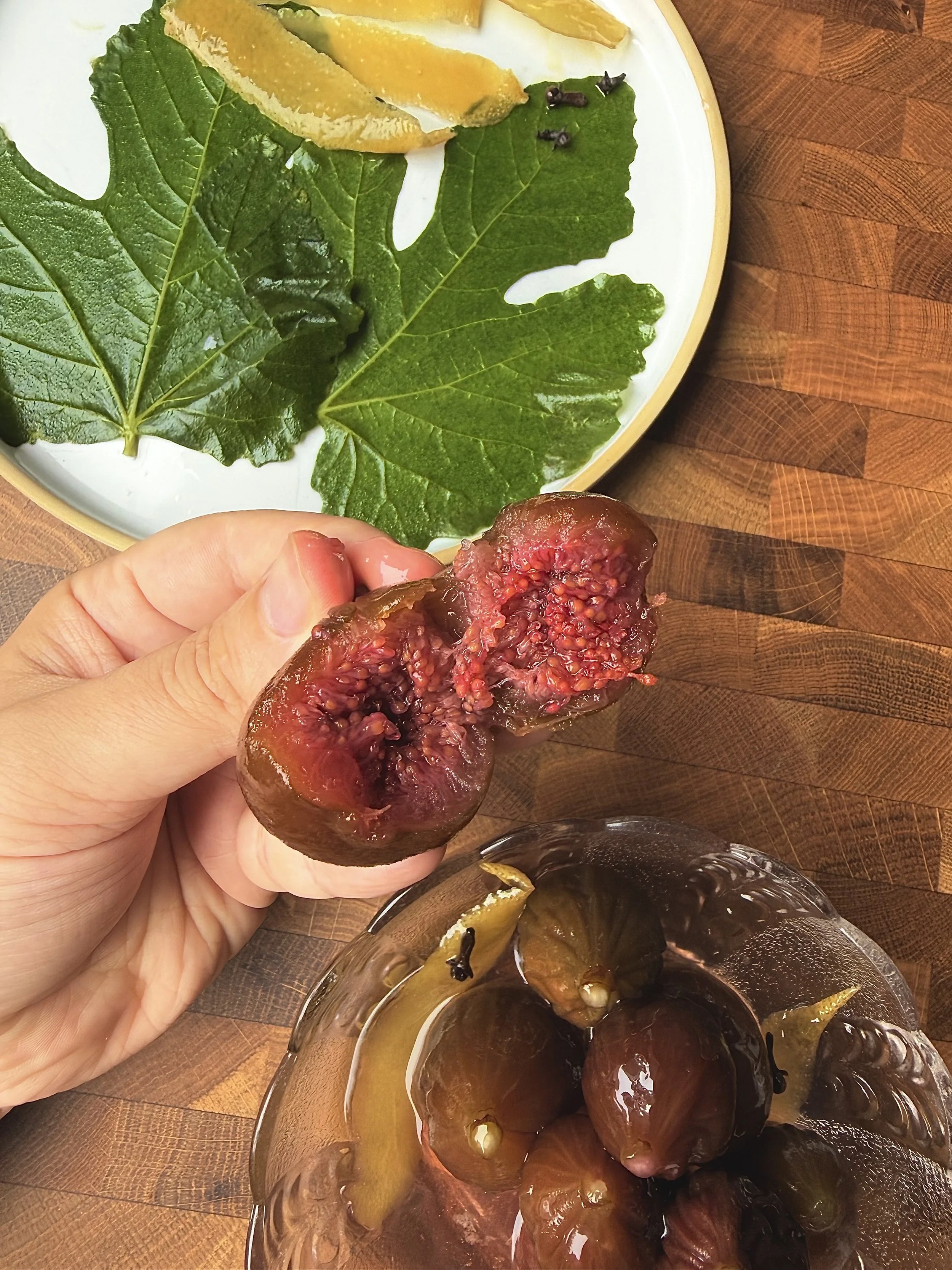 After 24 hours take out from fridge, toss the fig leaves and place figs on seperate plate, leaving the syrup in the pot and place on low heat allowing to reduce the syrup until thickened a little bit (about 10 minutes). Add in the lemon juice and place the figs back in and gently simmer all together for 5 minutes. Jar up and place in fridge and enjoy for up to 1 year, if stored properly in sterilised jar.